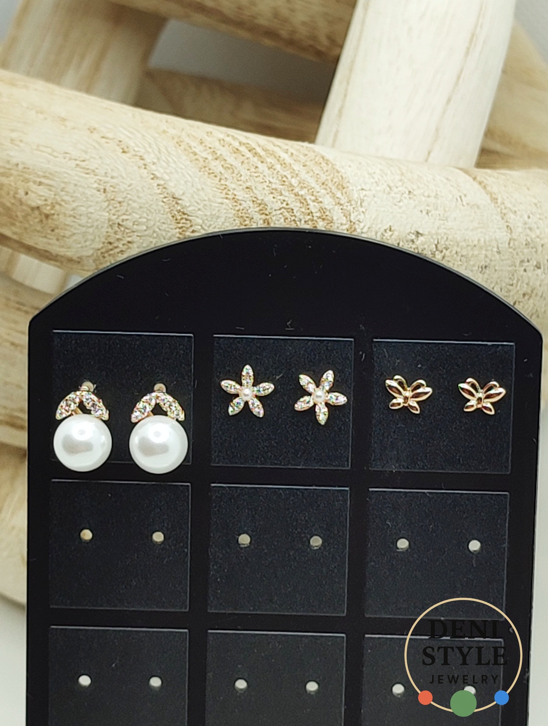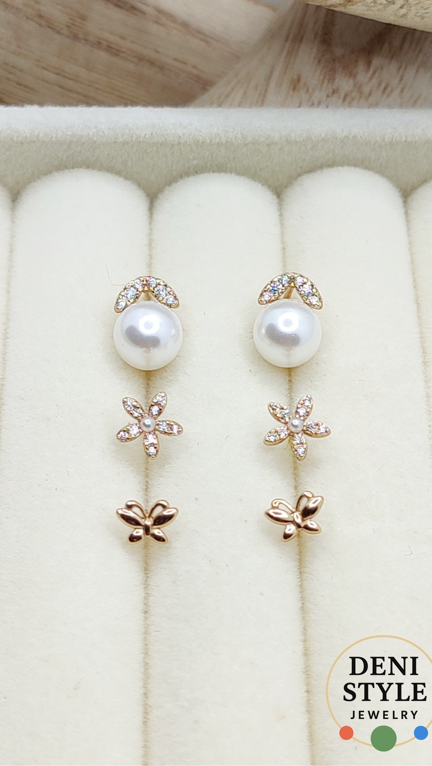 Sokoldalú és elegáns fülbevaló szett, amely három különböző stílust kínál egy csomagban. A klasszikus gyöngyös, a csillogó virágos és a bájos pillangós fülbevaló mind antiallergén anyagból készült, így kényelmes és biztonságos viselet. Tökéletes választás mindennapi használatra vagy különleges alkalmakra, hiszen mindig megtalálhatod a hangulatodhoz illőt.