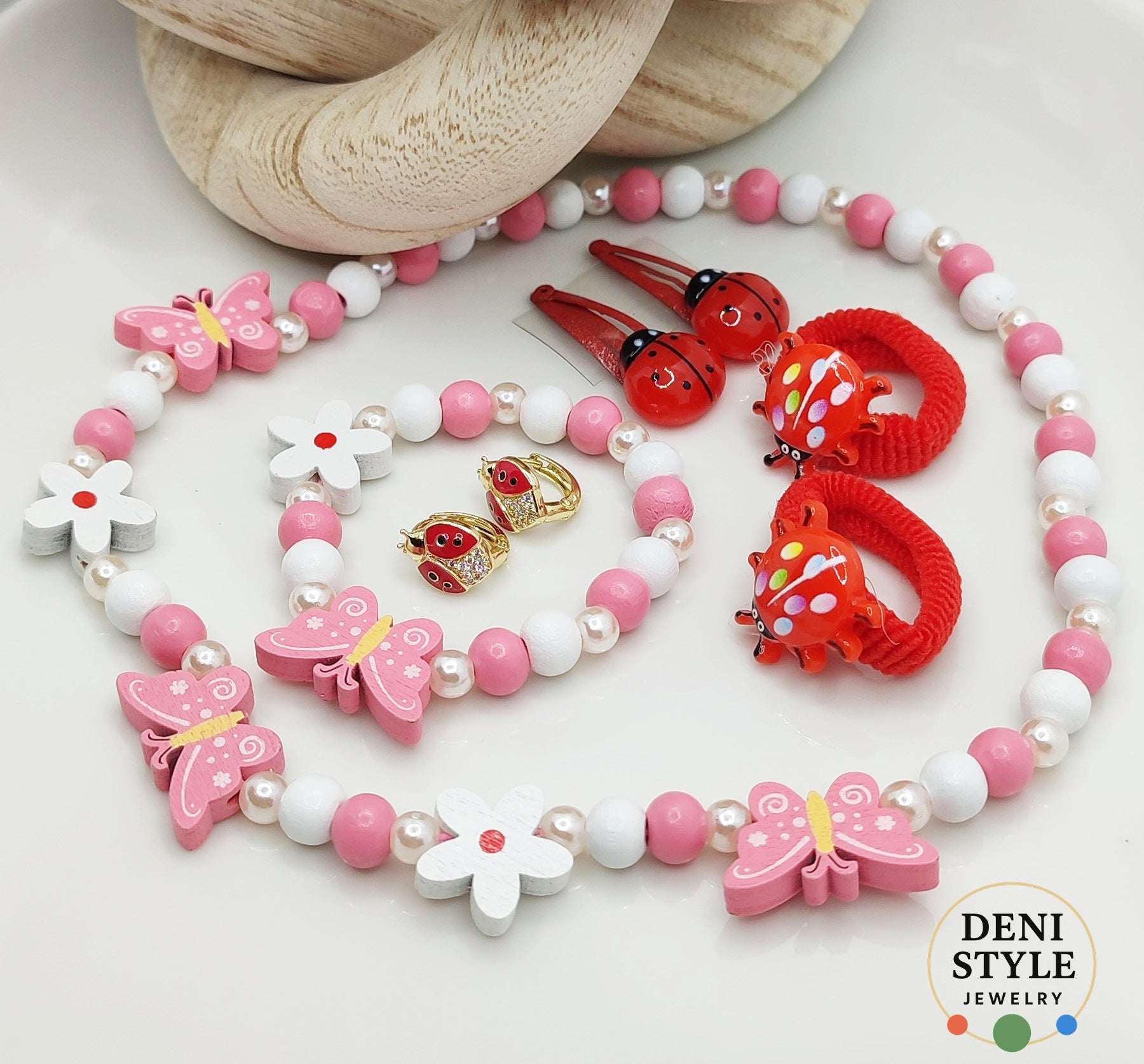 A szett tartalmaz egy nyakláncot, karkötőt és fülbevalópárt – mindezt imádnivaló rózsaszín, fehér és gyöngyház árnyalatokban!