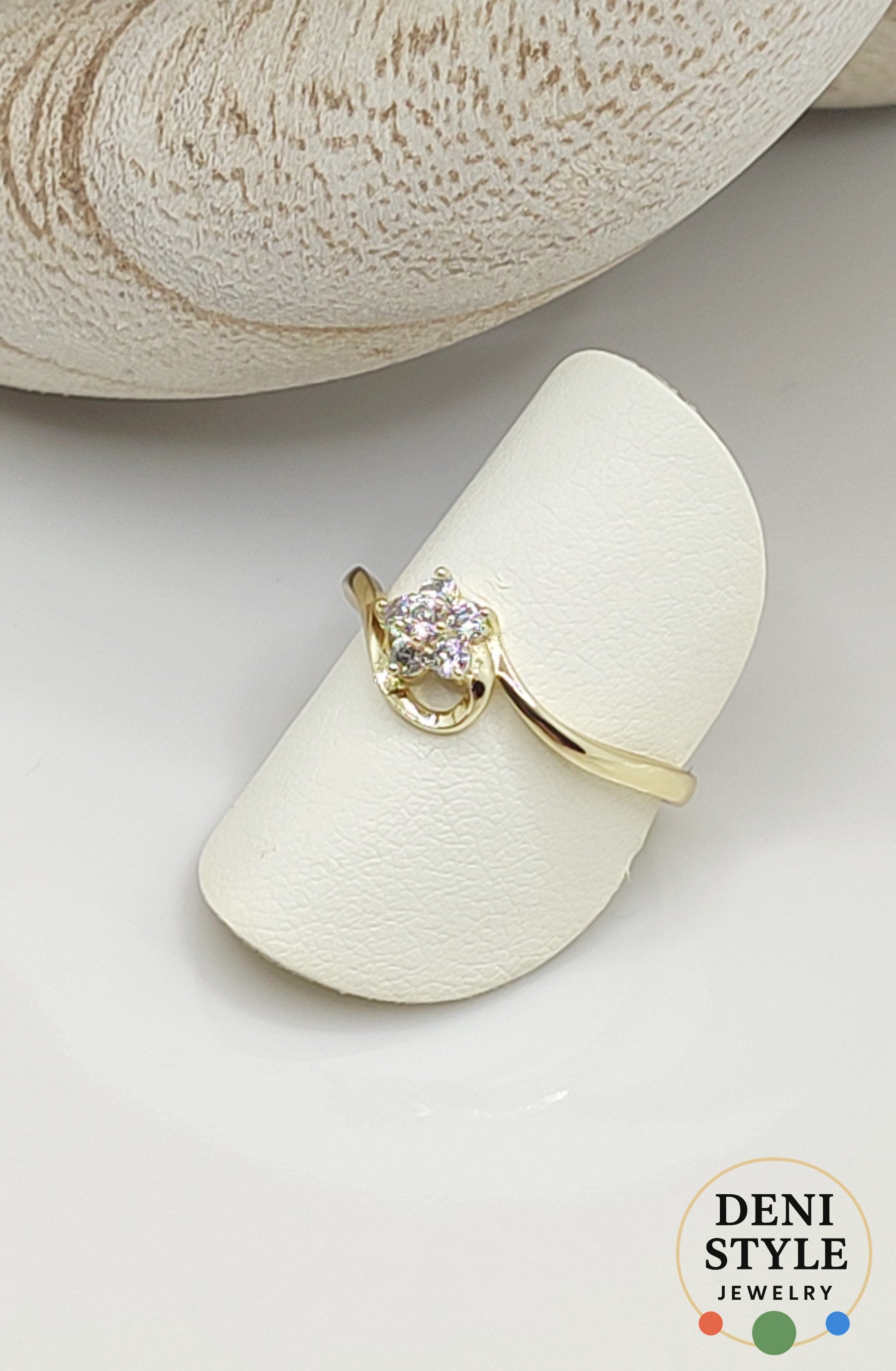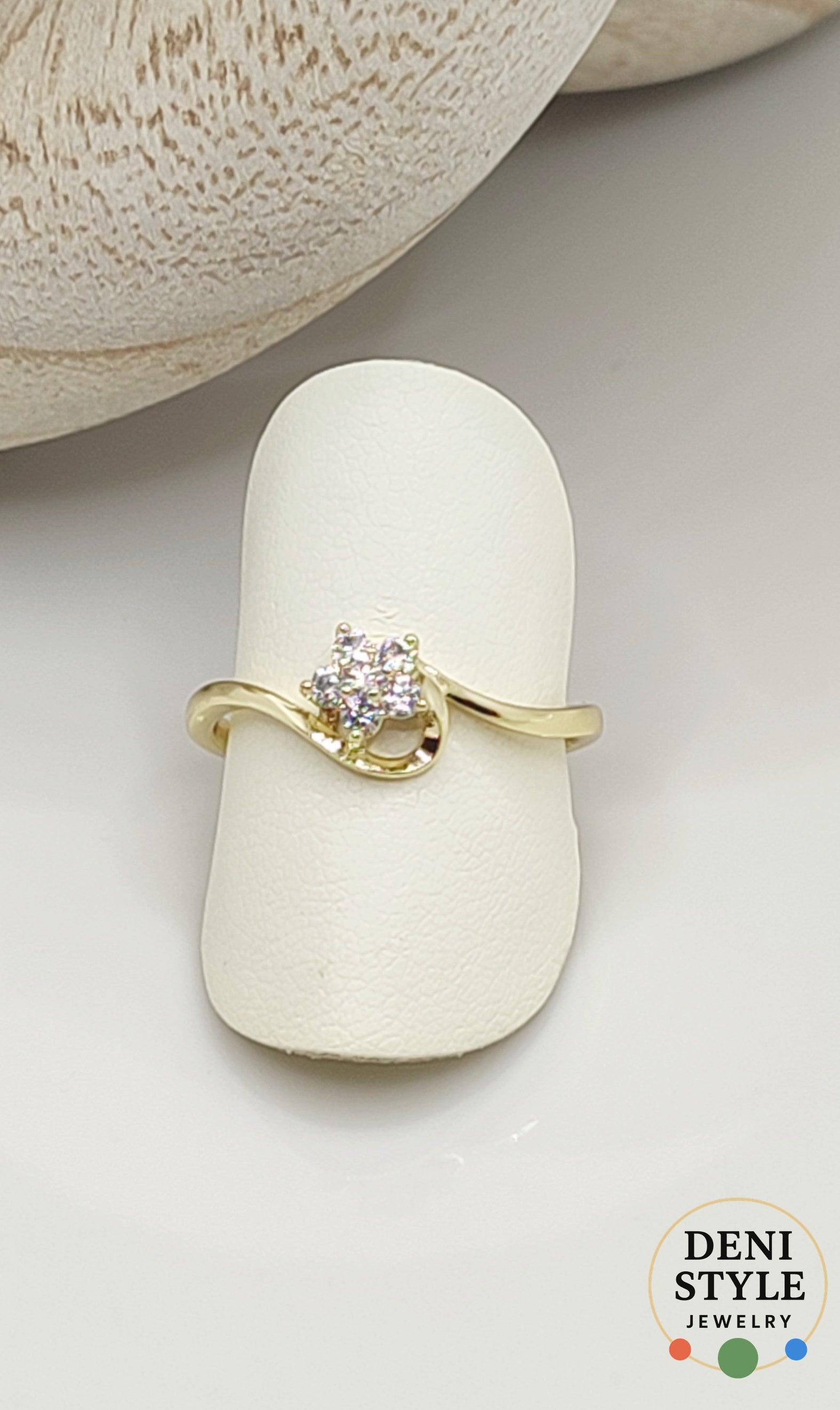 Finoman ívelt vonalvezetésű gyűrű, középpontjában ragyogó, virágformában elrendezett kristályokkal.