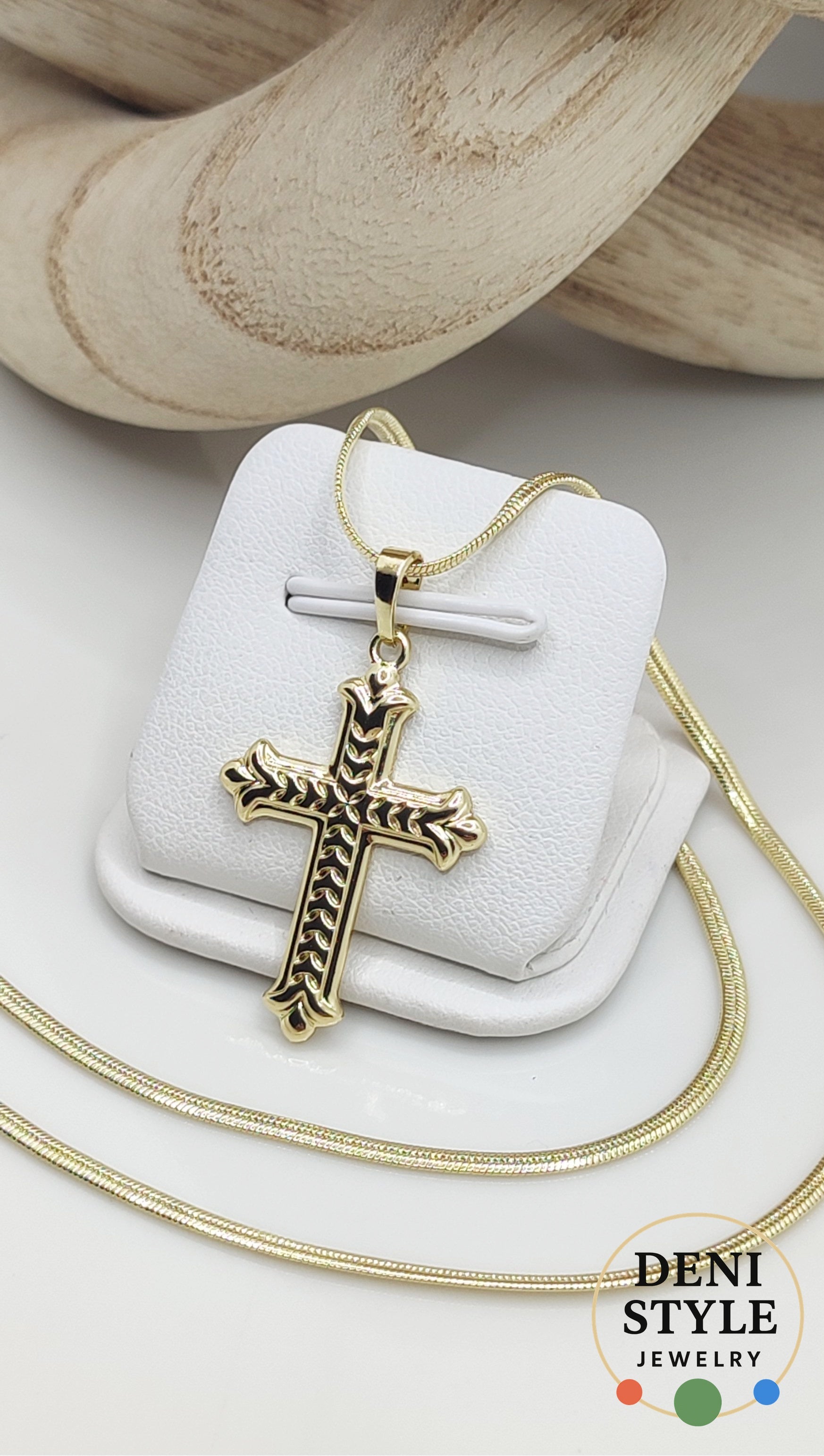 Erőteljes, mégis letisztult megjelenésű antiallergén nyaklánc díszes, aranyszínű kereszt medállal.