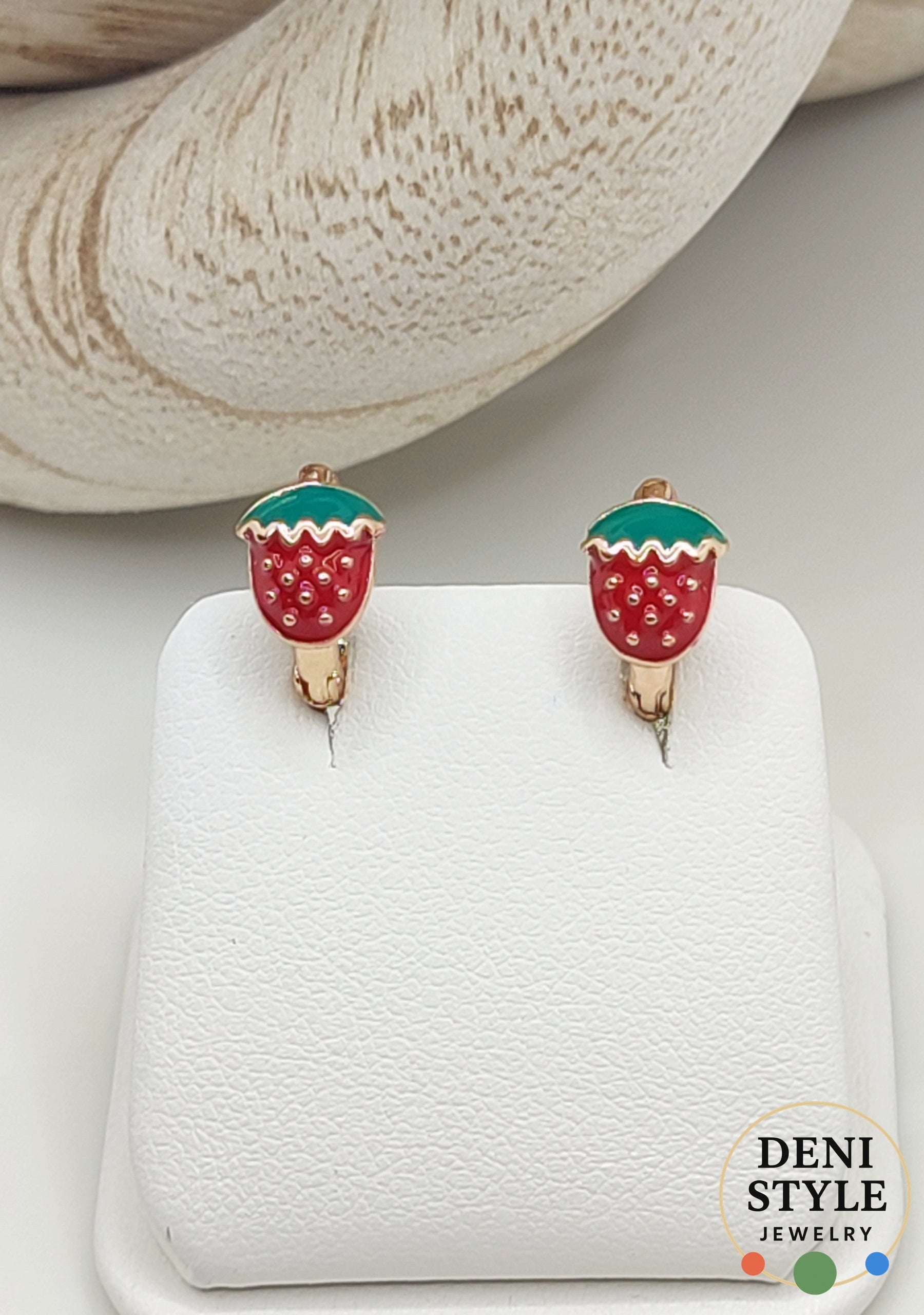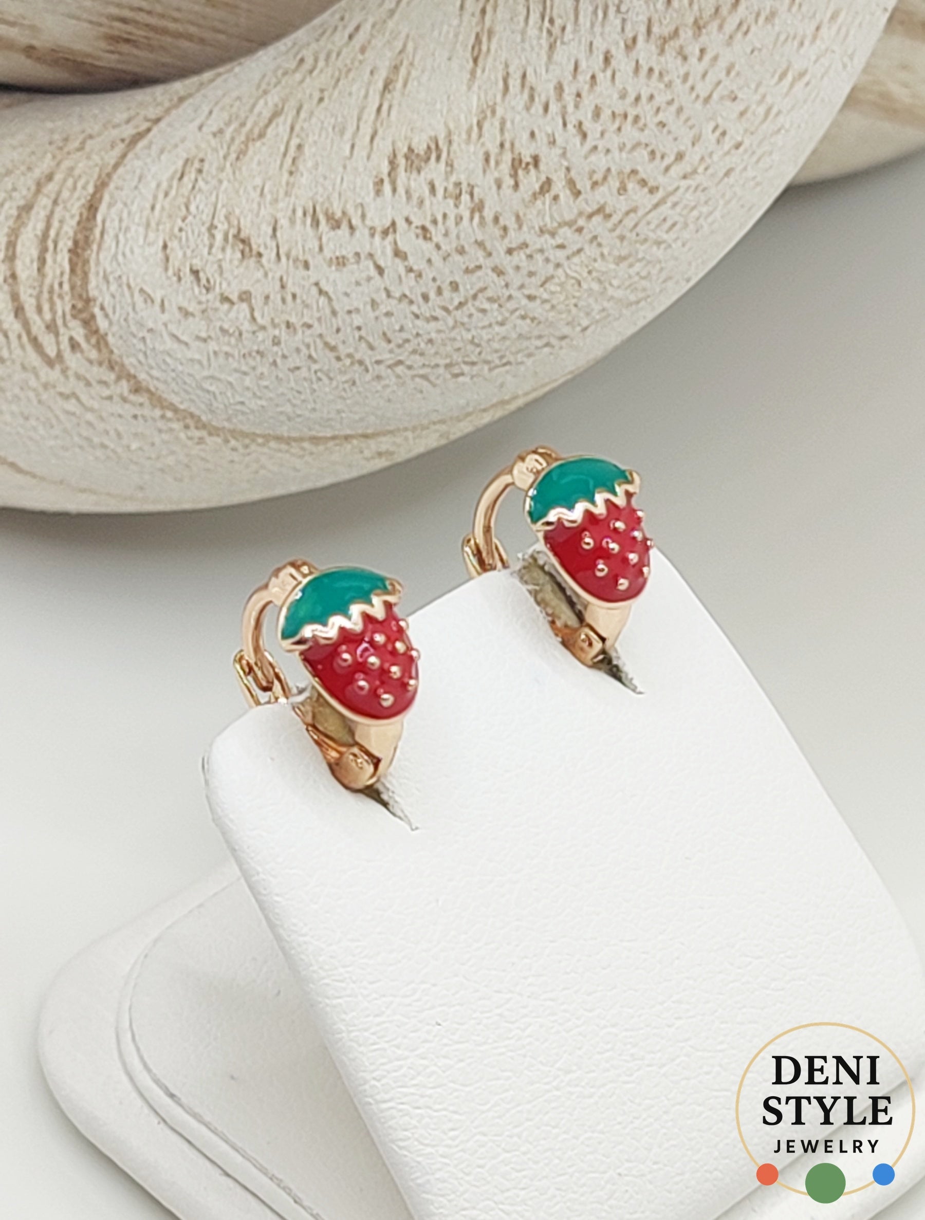 Aranyos, vidám megjelenésű gyermek fülbevaló, piros eper mintával és zöld levelekkel. Könnyű, antiallergén kialakítása miatt biztonságosan viselhető a legkisebbek számára is. 18K arany színű bevonata tartós fényt biztosít, így tökéletes választás mindennapi viselethez vagy ajándéknak is.