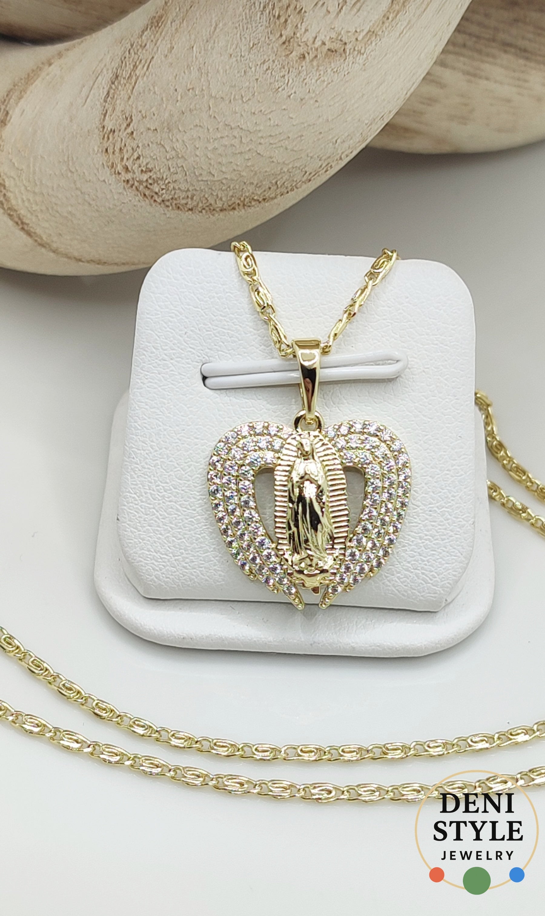 Különleges szív alakú medállal készült nyaklánc, amelyben Szűz Mária alakja jelenik meg finoman kidolgozott részletekkel. A cirkónia kövekkel ékesített keret elegáns ragyogást ad, miközben a medál szimbolikája a védelemre, szeretetre és belső békére emlékeztet. 14K arany színű bevonata tartós fényt biztosít, nem kopik és nem színeződik el. Antiallergén kialakítása érzékeny bőrre is ideális választás.