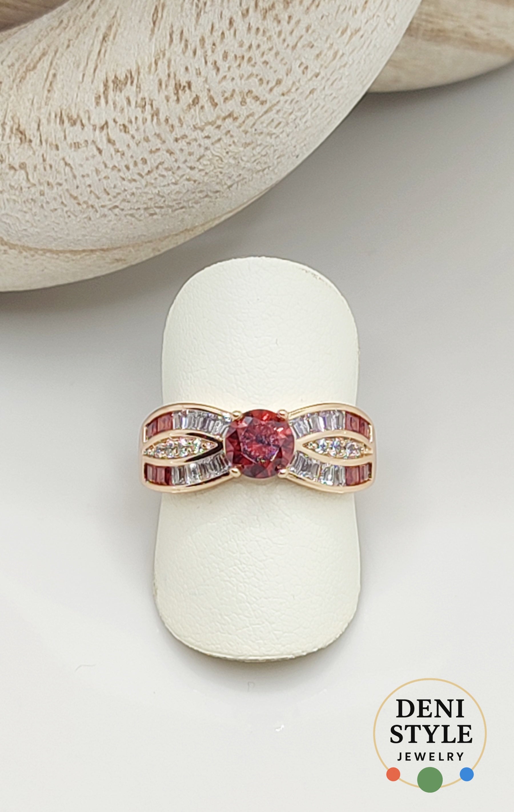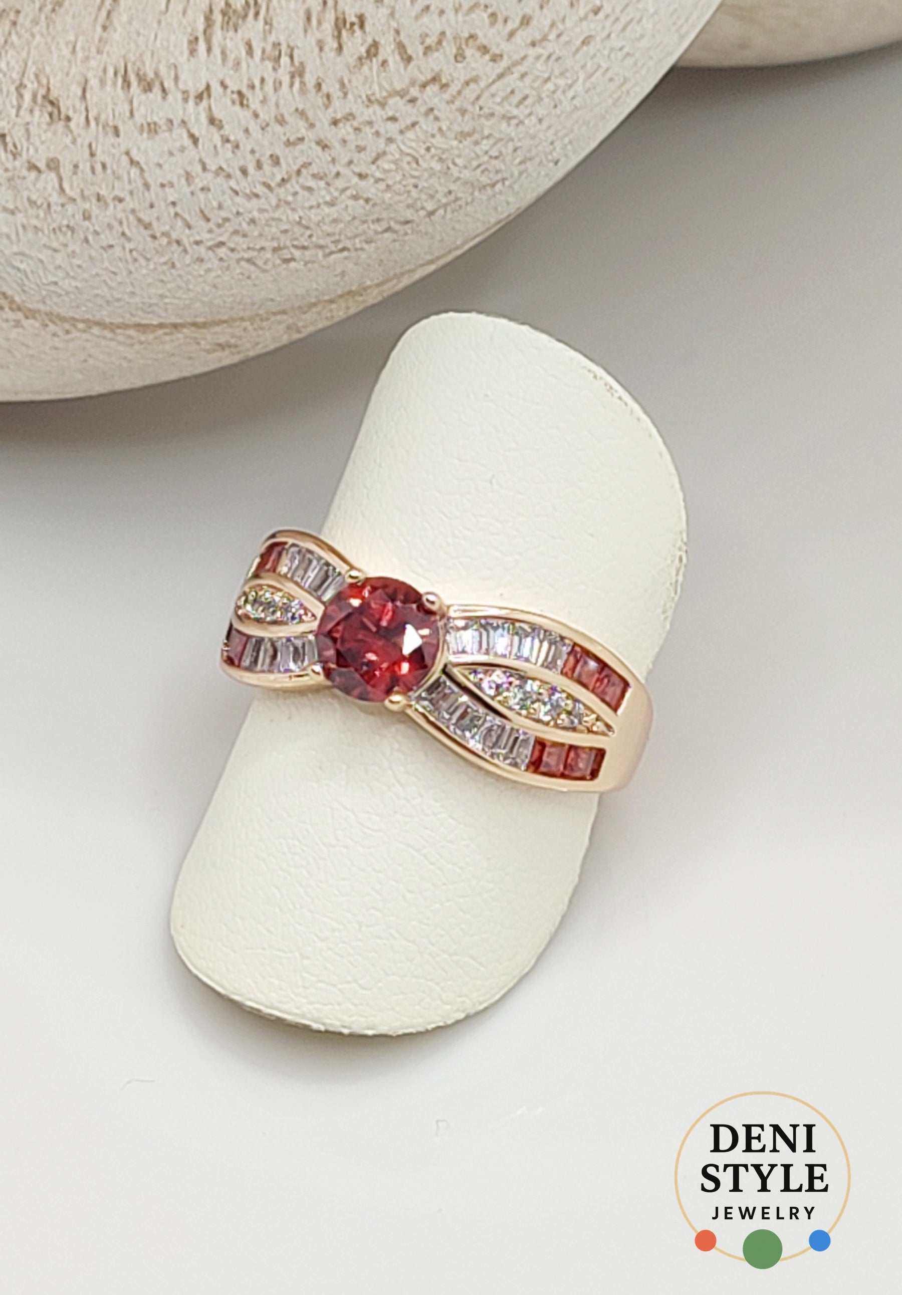 Középpontjában a mélyvörös kő ragyog, amelyet csillogó kristályok és finom arany árnyalat vesz körül.