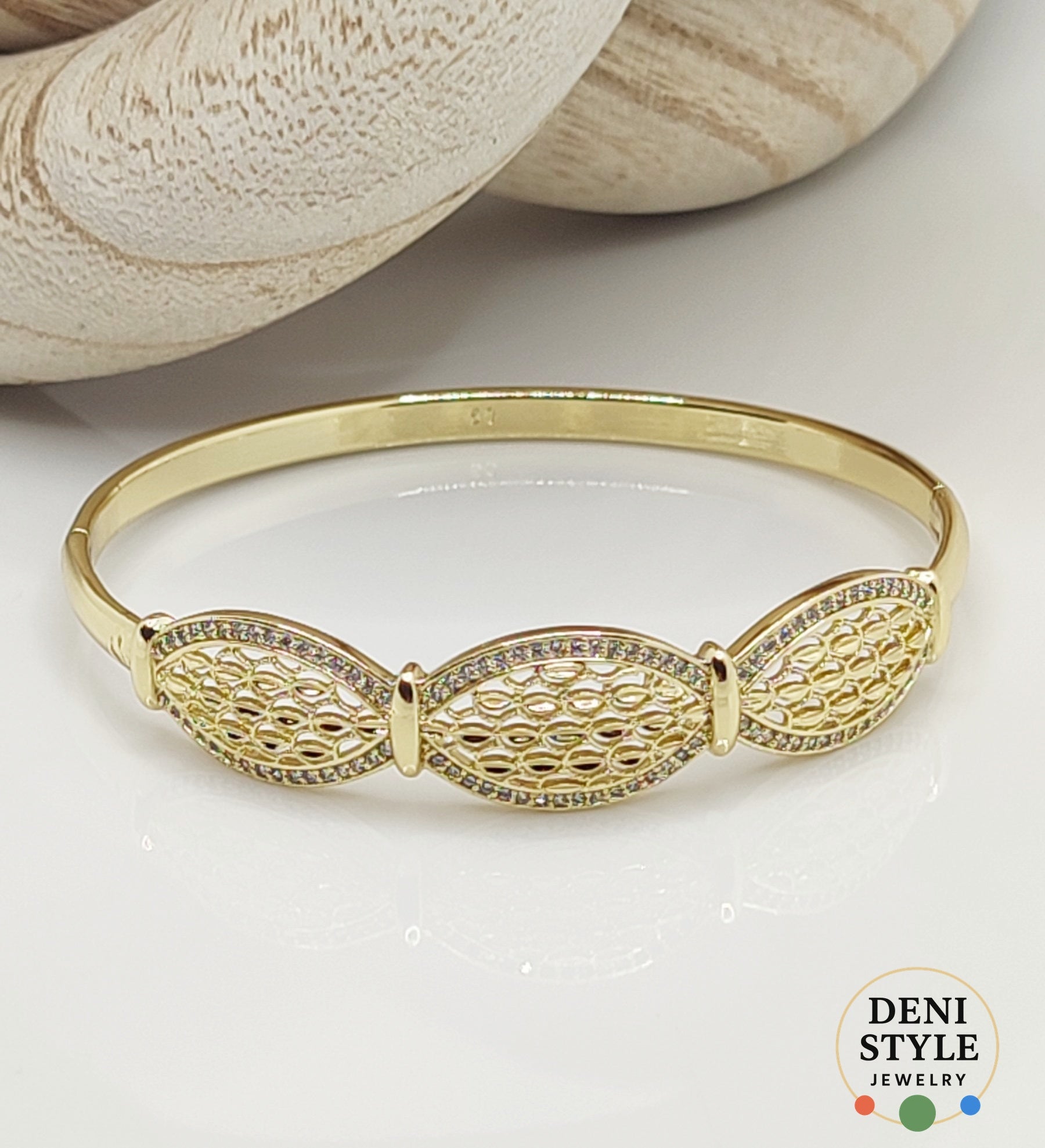 Elegáns, kifinomult karperec részletes, áttört mintázattal és finoman csillogó kristályokkal keretezve.