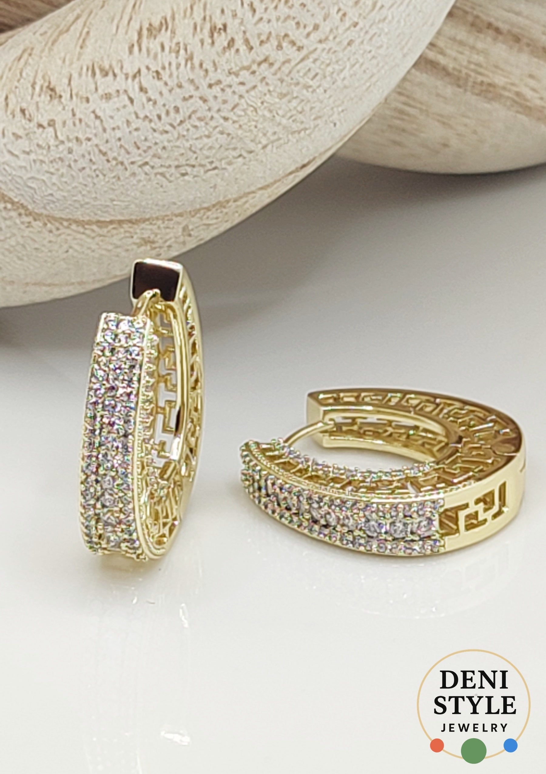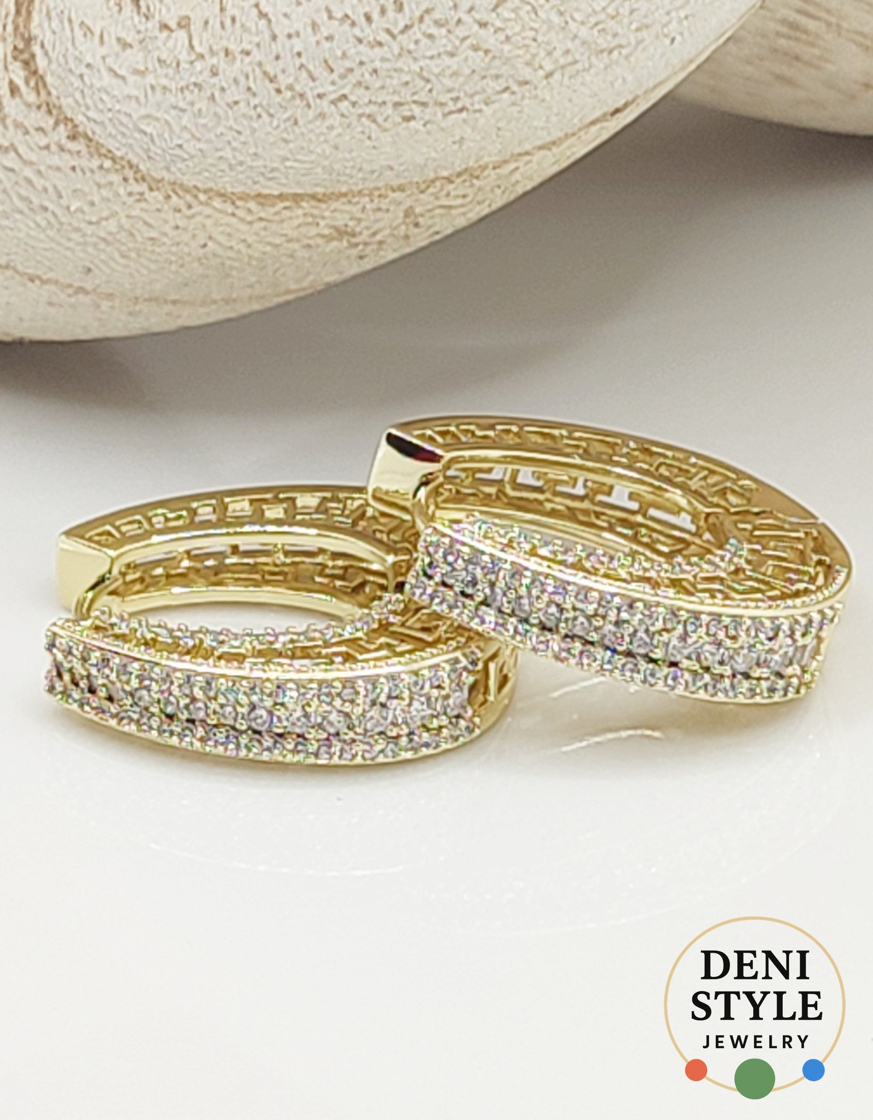 Kifinomult, ragyogó aranyszínű fülbevaló, melyet apró kristályok díszítenek három sorban.
