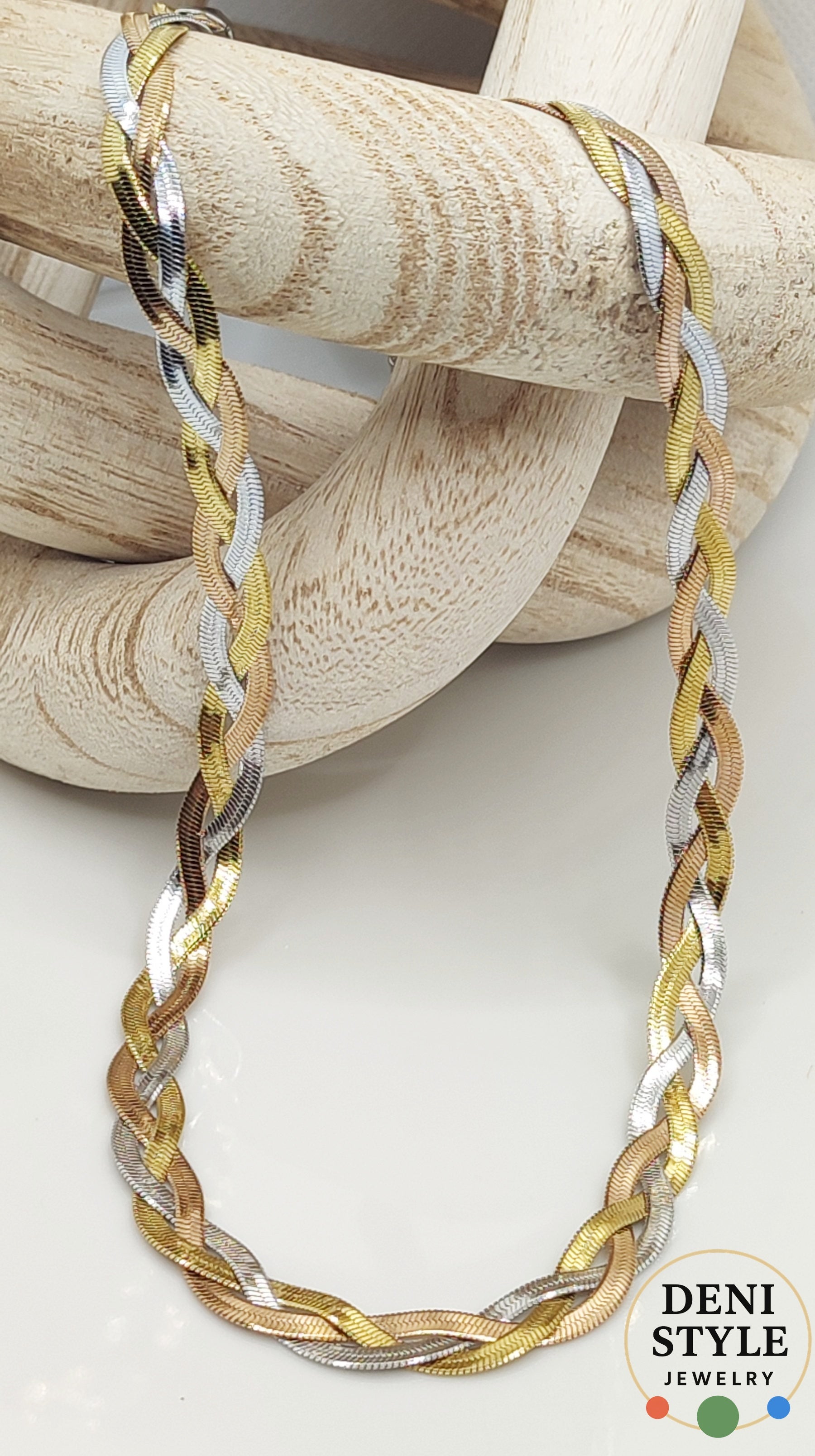 Háromszínű, elegáns fonott nyaklánc, amely a modern stílust és a klasszikus eleganciát ötvözi. A nemesacél anyag tartós, és fényét hosszú távon is megőrzi.