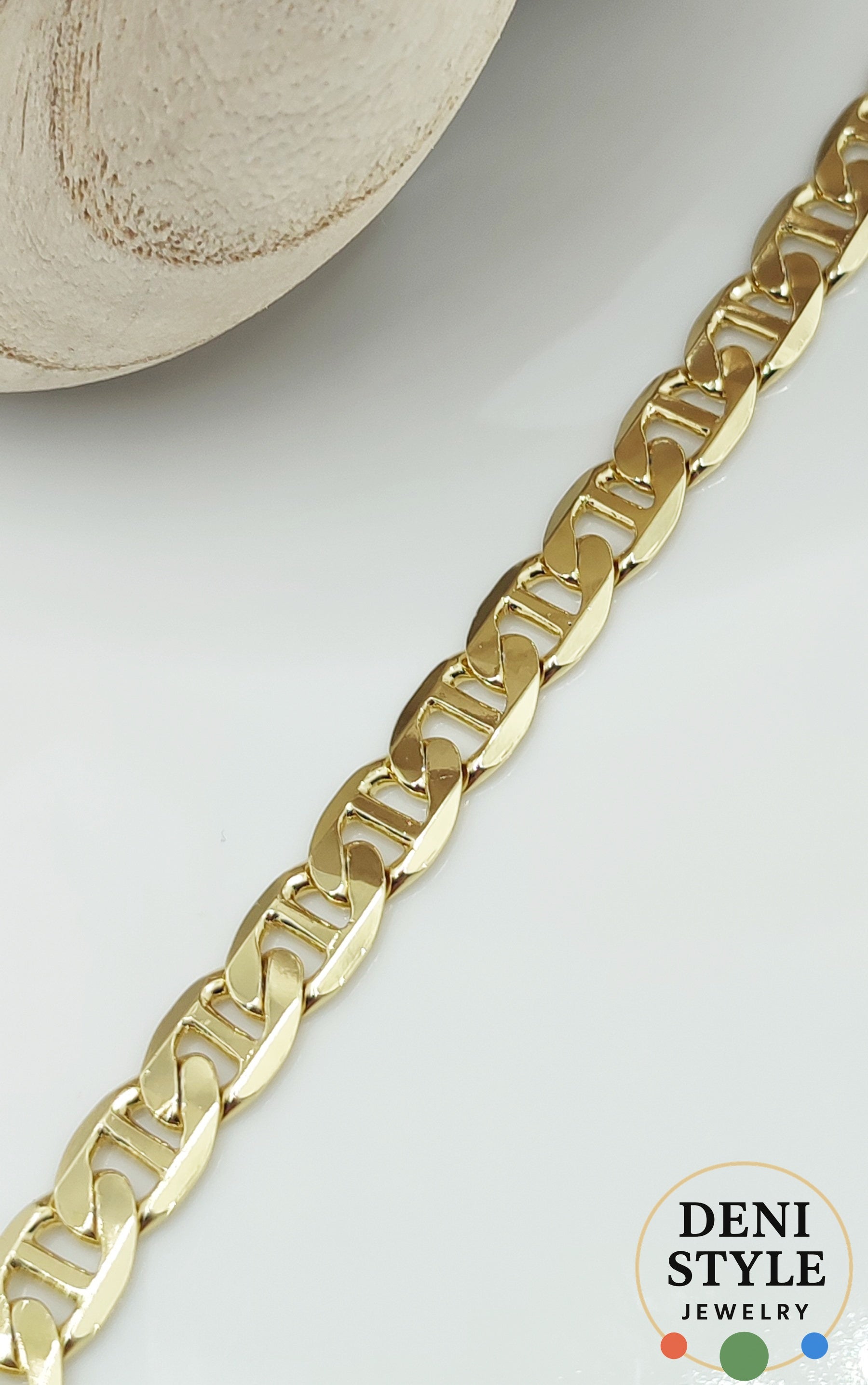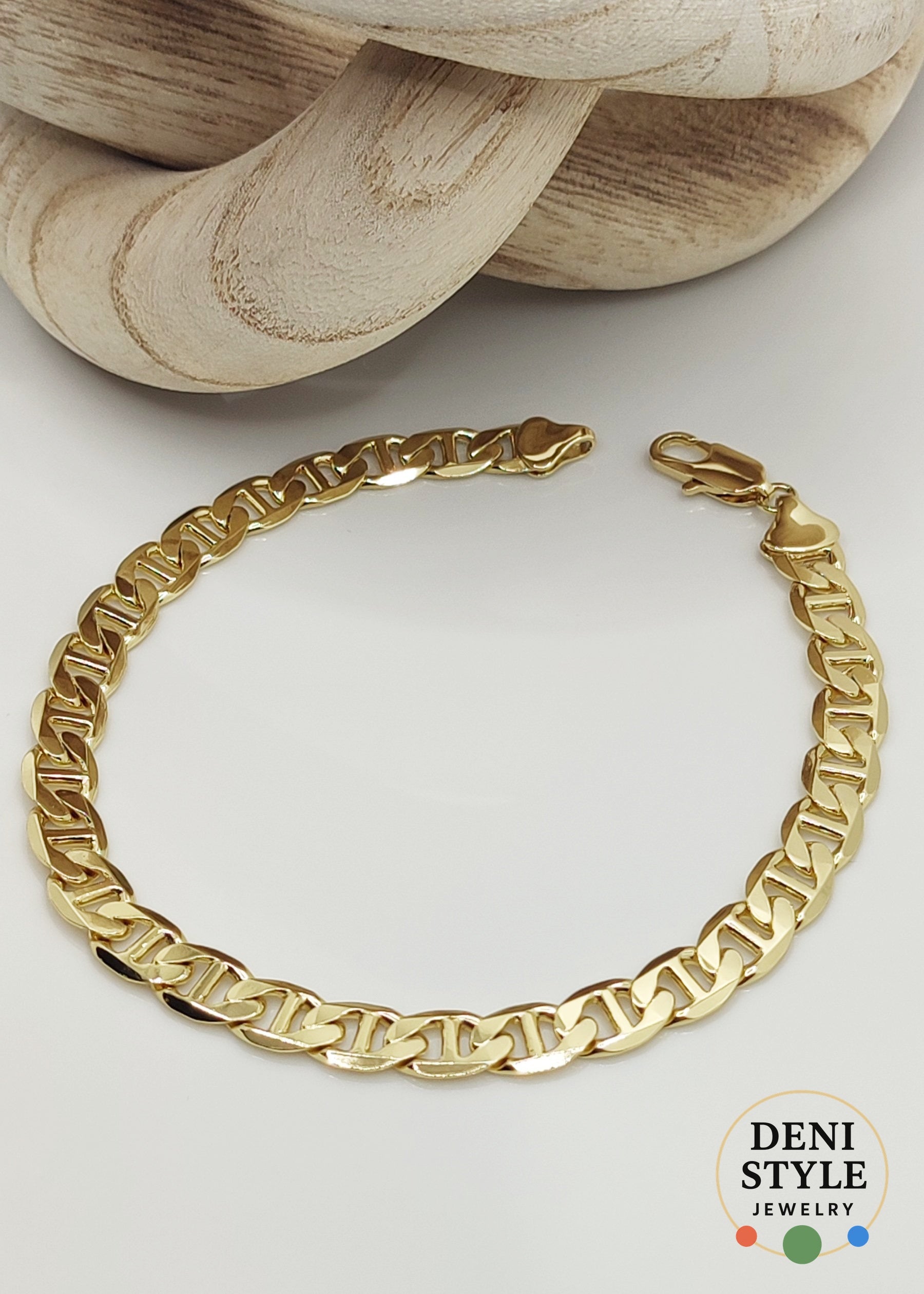 Klasszikus, letisztult láncszemes karkötő, amely a mindennapi elegancia egyik alapdarabja lehet. 14K arany színű bevonata tartós fényt biztosít, nem kopik és nem színeződik el. Antiallergén kialakítása miatt érzékeny bőrre is biztonságosan viselhető. Erős, stabil kapoccsal készült, így hosszú távon is kényelmes és megbízható viselet.