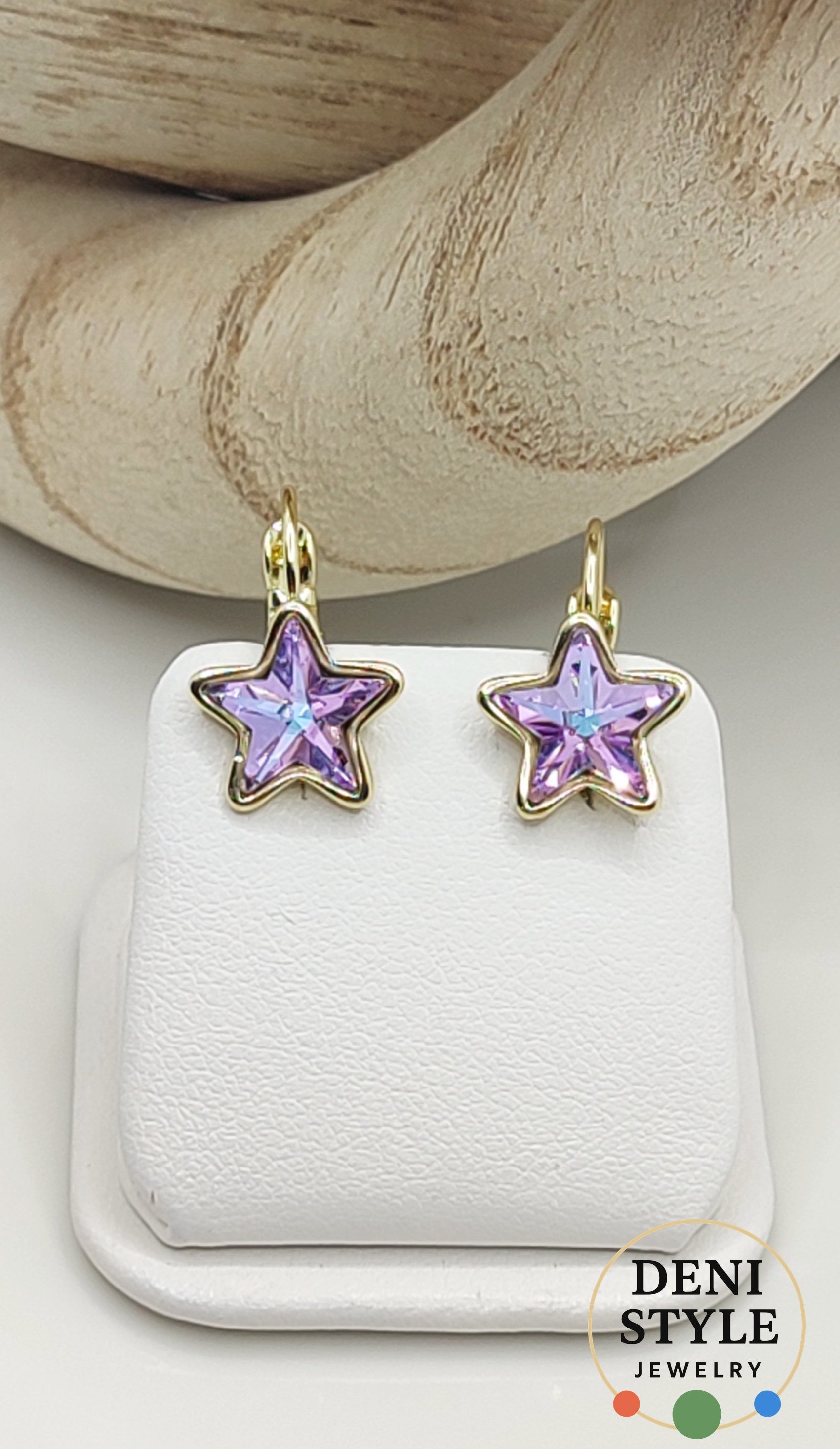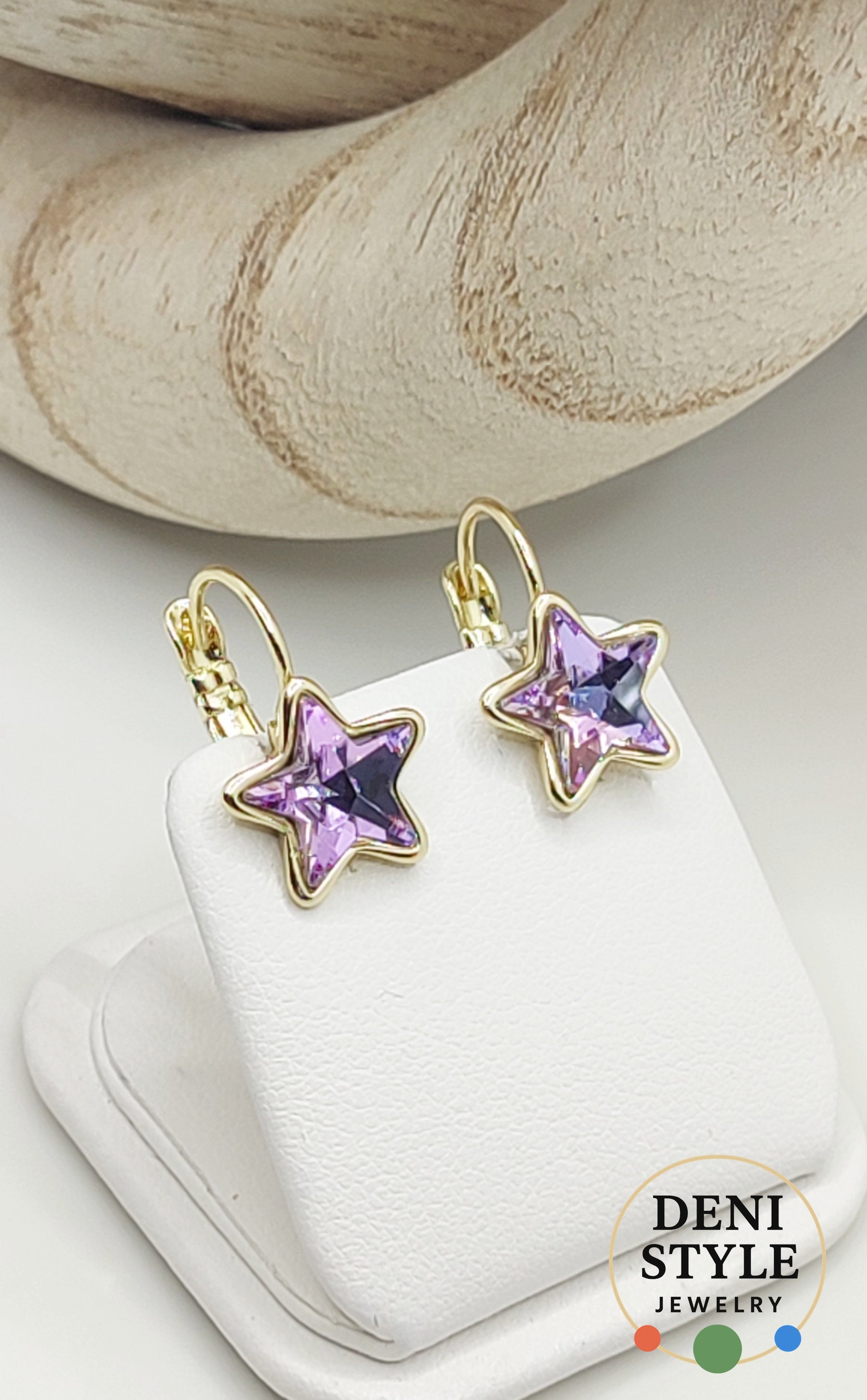 Különleges csillag formájú, lila fényű kristályokkal díszített fülbevaló, amely játékosan elegáns megjelenést ad. A 14K arany színű foglalat kiemeli a kristályok ragyogását és finoman keretezi a formát. Antiallergén kialakítása miatt érzékeny fülre is biztonságosan viselhető. Kényelmes kapcsos záródása stabil, egész napos viseletet biztosít.
