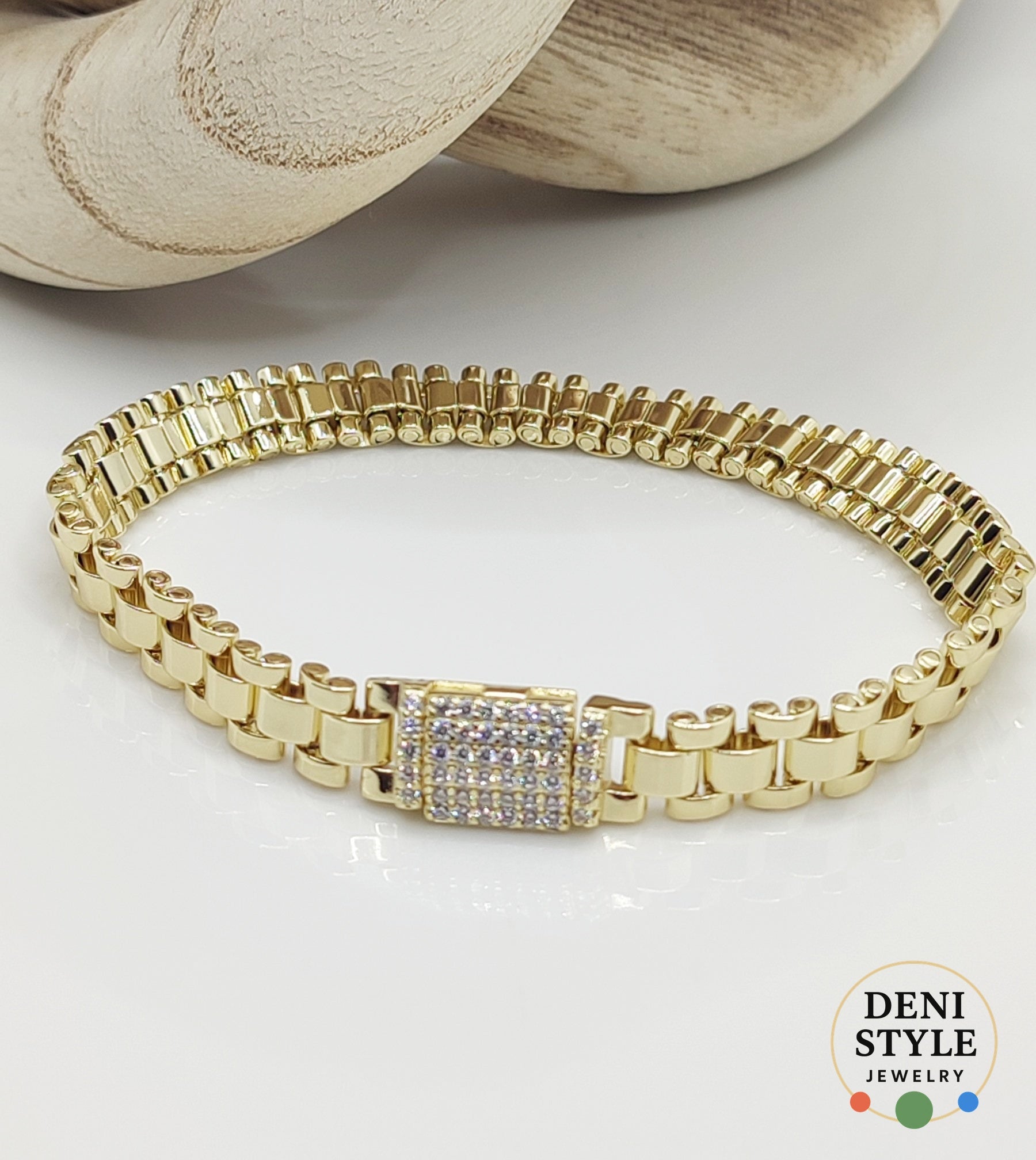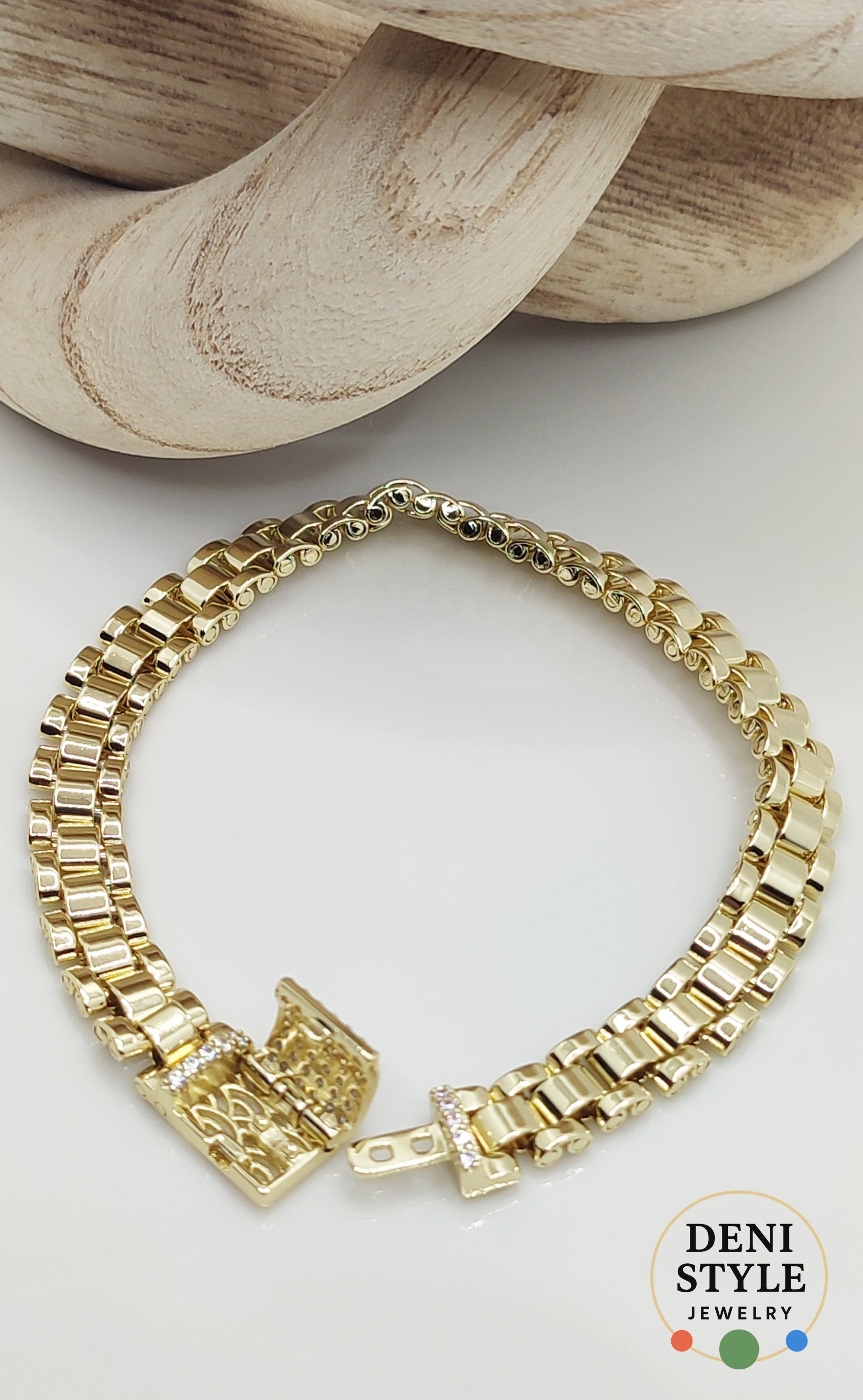 Masszív, mégis elegáns kialakítású karkötő fényes arany hatással és ragyogó kristályokkal kirakott középrésszel.