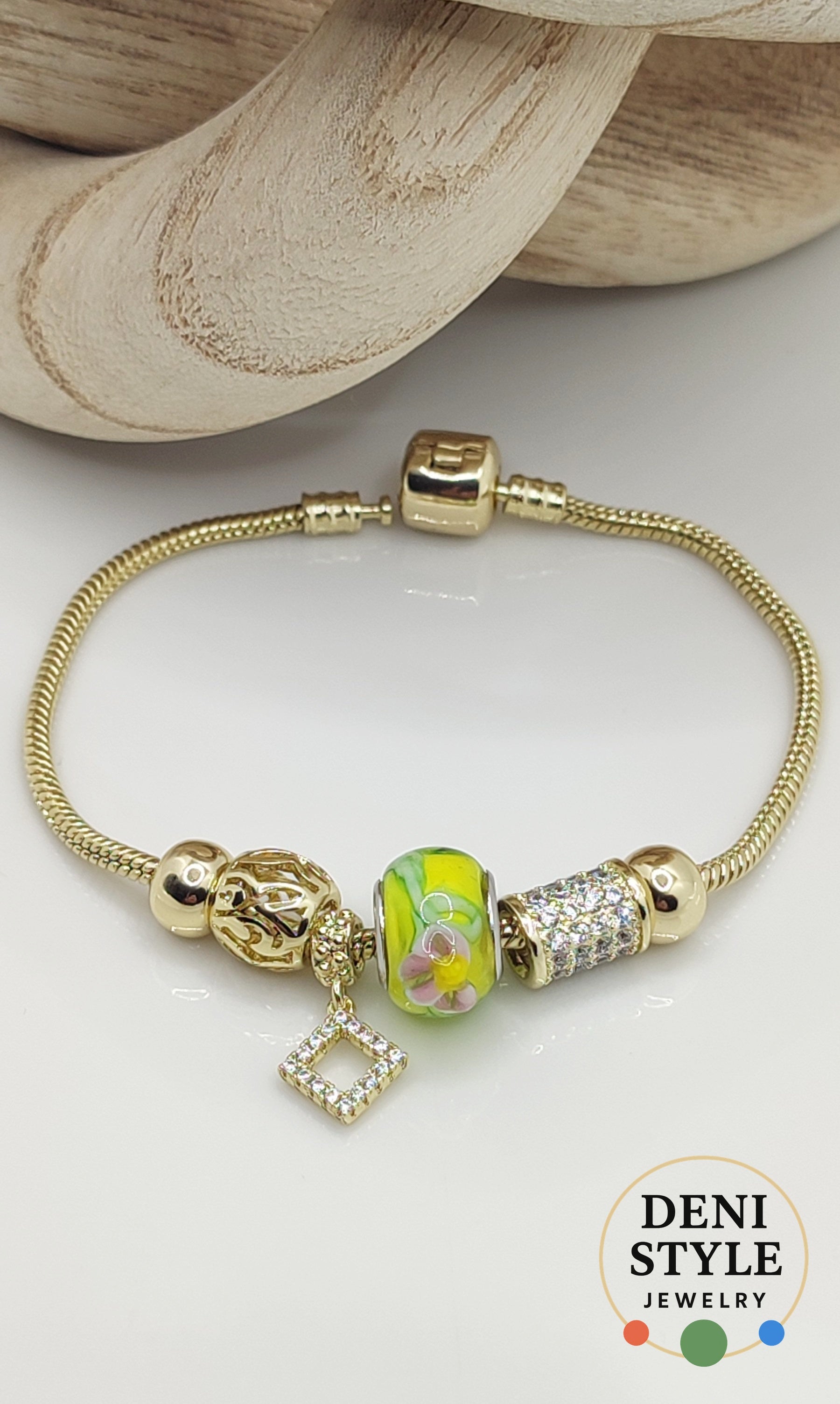 Különleges, 14K hatású aranyszínű karkötő friss, tavaszias hangulatú üvegcharmmal és csillogó díszítőelemekkel. A minőségi, bőrbarát felület fémérzékenyek számára is kényelmes viseletet biztosít, miközben a masszív alap hosszú távú tartósságot ad. Egyedi, vidám megjelenést kölcsönöz, amely mindennapokhoz és alkalmakra is tökéletes választás.