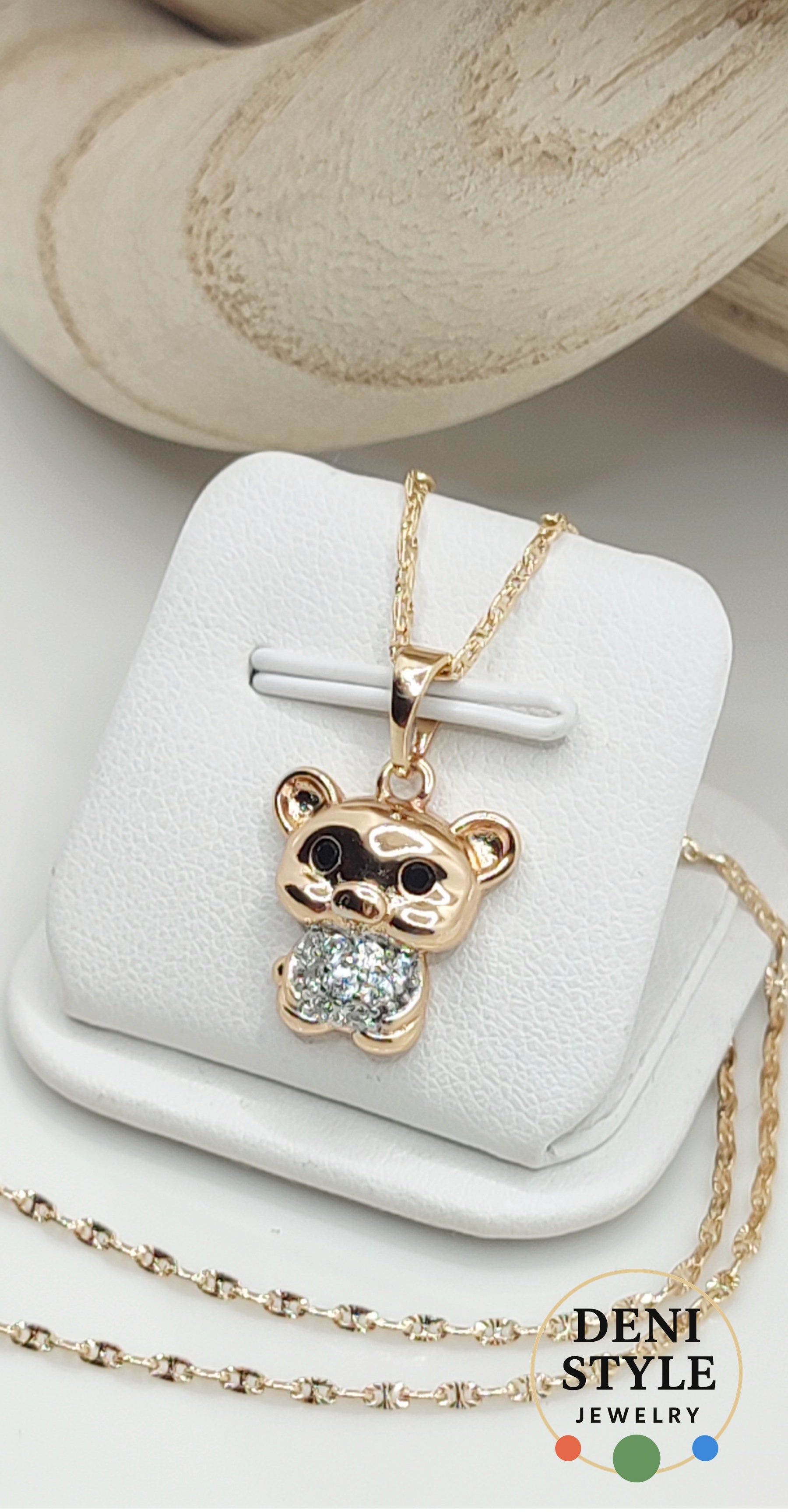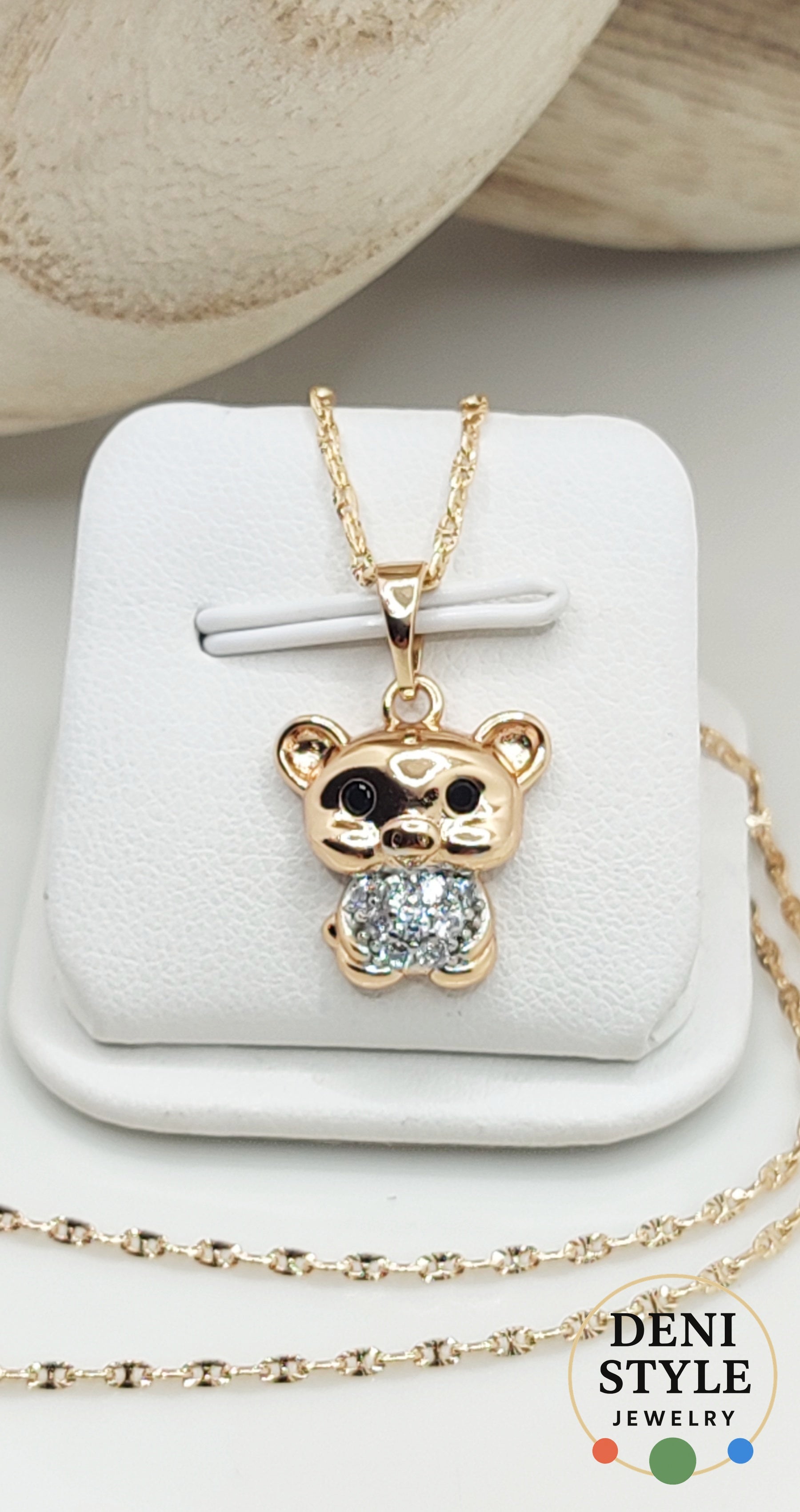 Aranyszínű, finoman megmunkált maci nyaklánc játékos, multicolor medállal. A fényesen csillogó medál kedves, modern megjelenést ad, miközben a bőrbarát, tartós anyag fémérzékenyek számára is ideális választás. Könnyű, kényelmes viselet mindennapokra és ajándéknak is tökéletes.