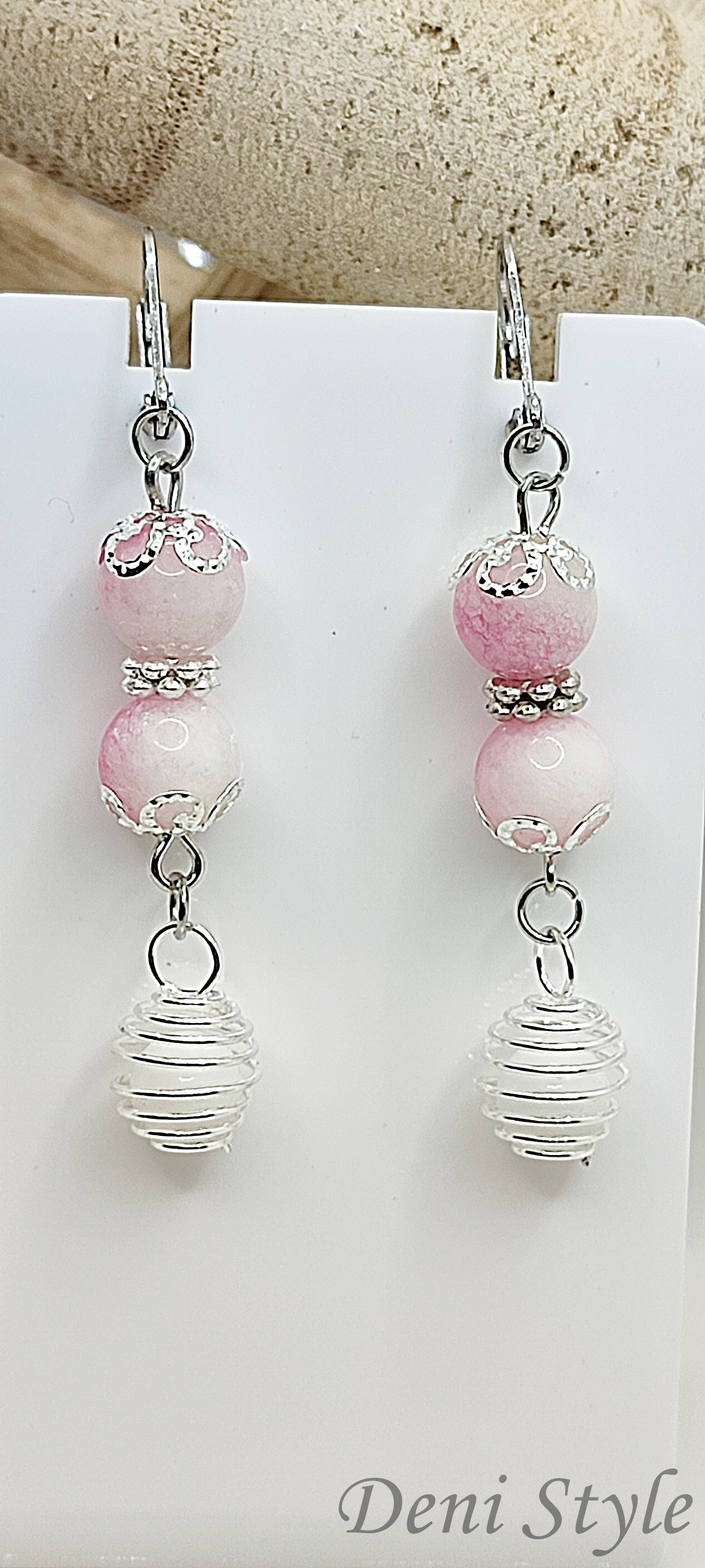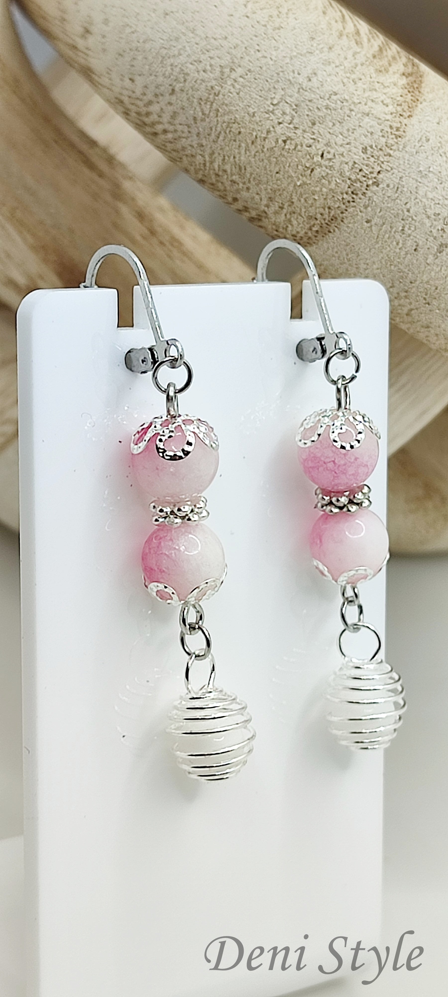 A fülbevaló finom rózsaszín árnyalataival a nőiesség és elegancia tökéletes harmóniáját tükrözi. Nemesacél kapoccsal készült. A gyöngyhatású rózsaszín ásványgolyókat ezüstszínű díszítések és spirál formájú függő teszik különlegessé. Ideális választás mindennapi viselethez és alkalmi megjelenéshez is.