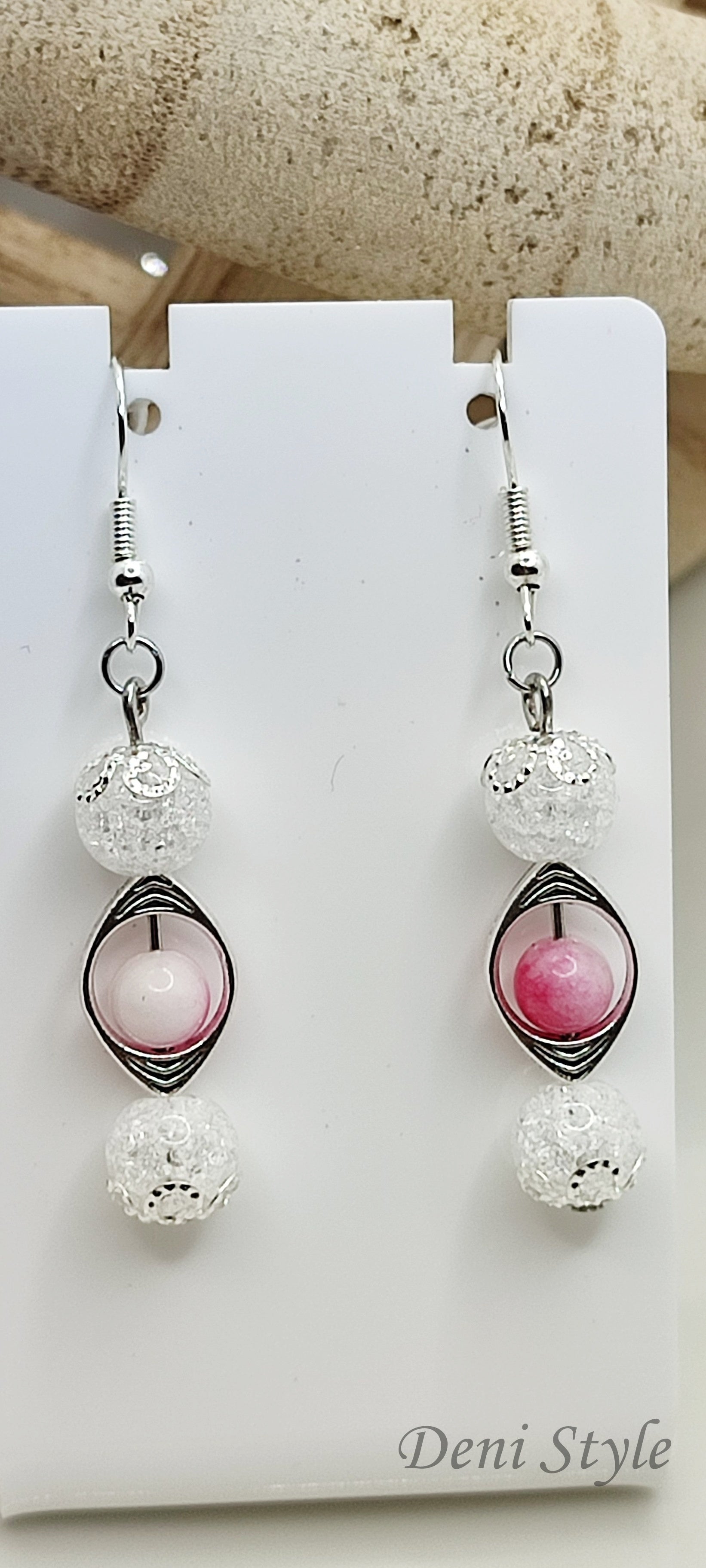 A fülbevaló különleges, modern megjelenésével a letisztult elegancia kedvelőinek készült. A nikkelmentes akasztó és a finoman csillogó gyöngyök kombinációja harmonikus összhatást kelt. A középső rózsaszín árnyalatú gömböt ezüstszínű, geometrikus keret öleli körül, ami játékos, mégis kifinomult stílust ad. Kiváló választás mindennapi viselethez és elegáns alkalmakhoz is.