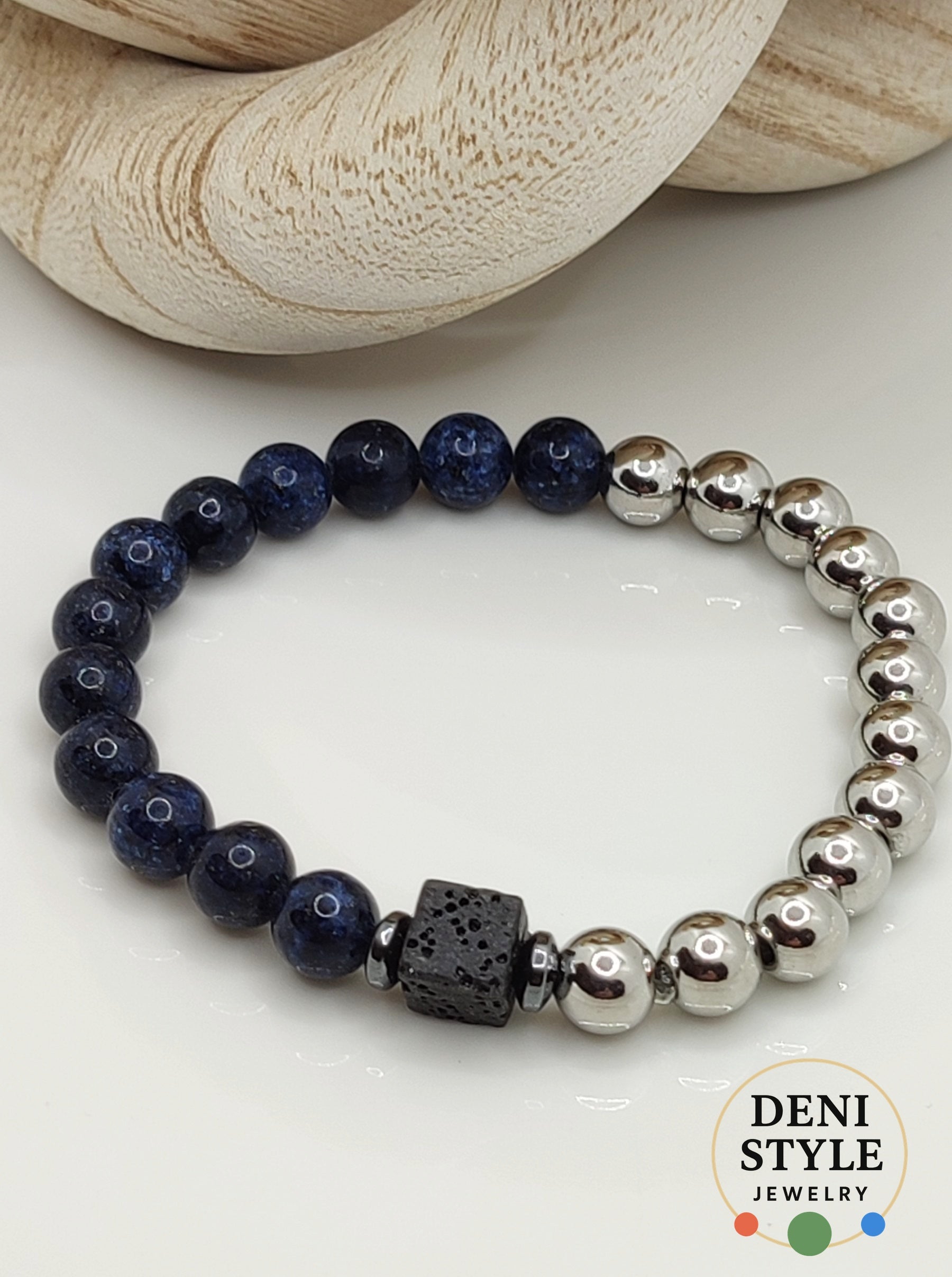 Elegáns és különleges megjelenésű karkötő, amely a gyönyörű lápisz-lazulit és a fényes hematitot egyesíti.