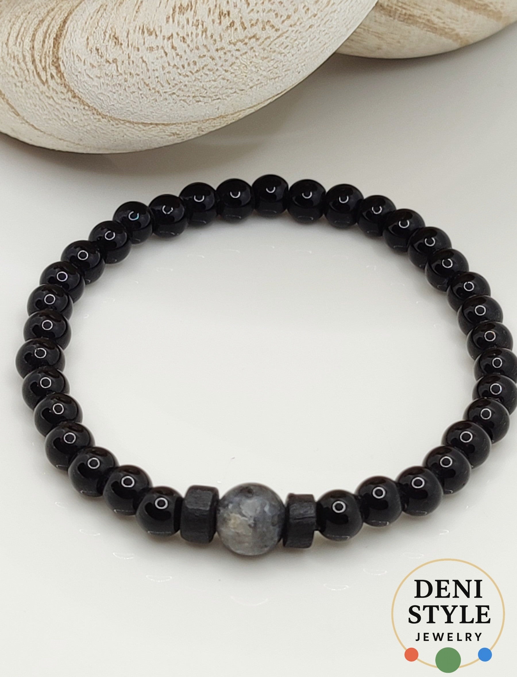 Elegáns, minimalista megjelenésű karkötő fekete onyx és szürke labradorit ásványgyöngyökből. A rugalmas szilikon alap kényelmes viseletet biztosít, miközben az onyx erőt és önbizalmat, a labradorit pedig harmóniát és védelmet hoz viselőjének. Klasszikus, mégis karakteres darab – bármely stílushoz illik.