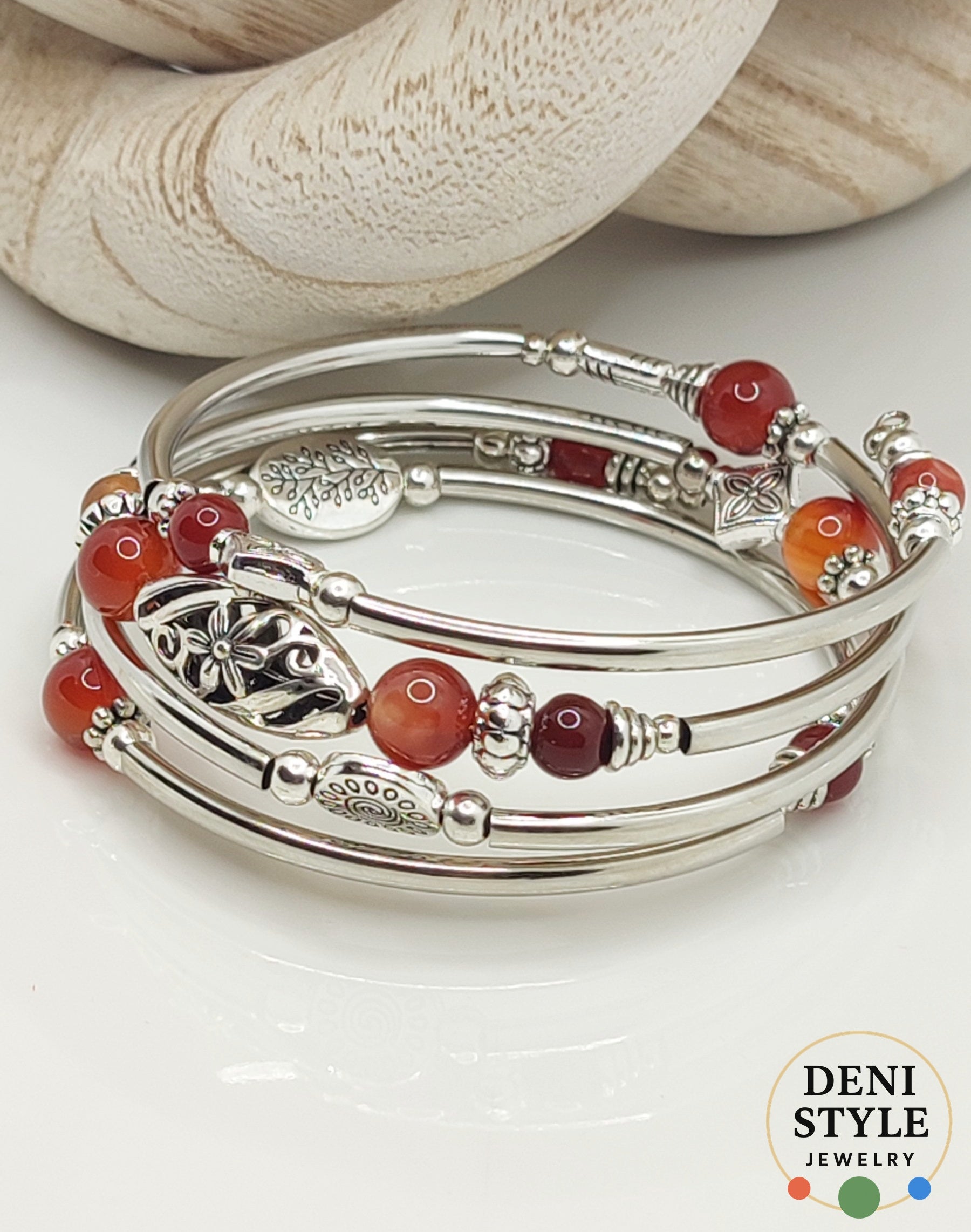 Látványos, mégis kifinomult divatkarkötő, amelyet természetes achát ásványok és ezüstszínű fém elemek díszítenek. A meleg vörös és narancs tónusok életenergiát, önbizalmat és védelmet sugároznak. A rugalmas, memórial alapnak köszönhetően minden csuklóméretre tökéletesen illeszkedik.