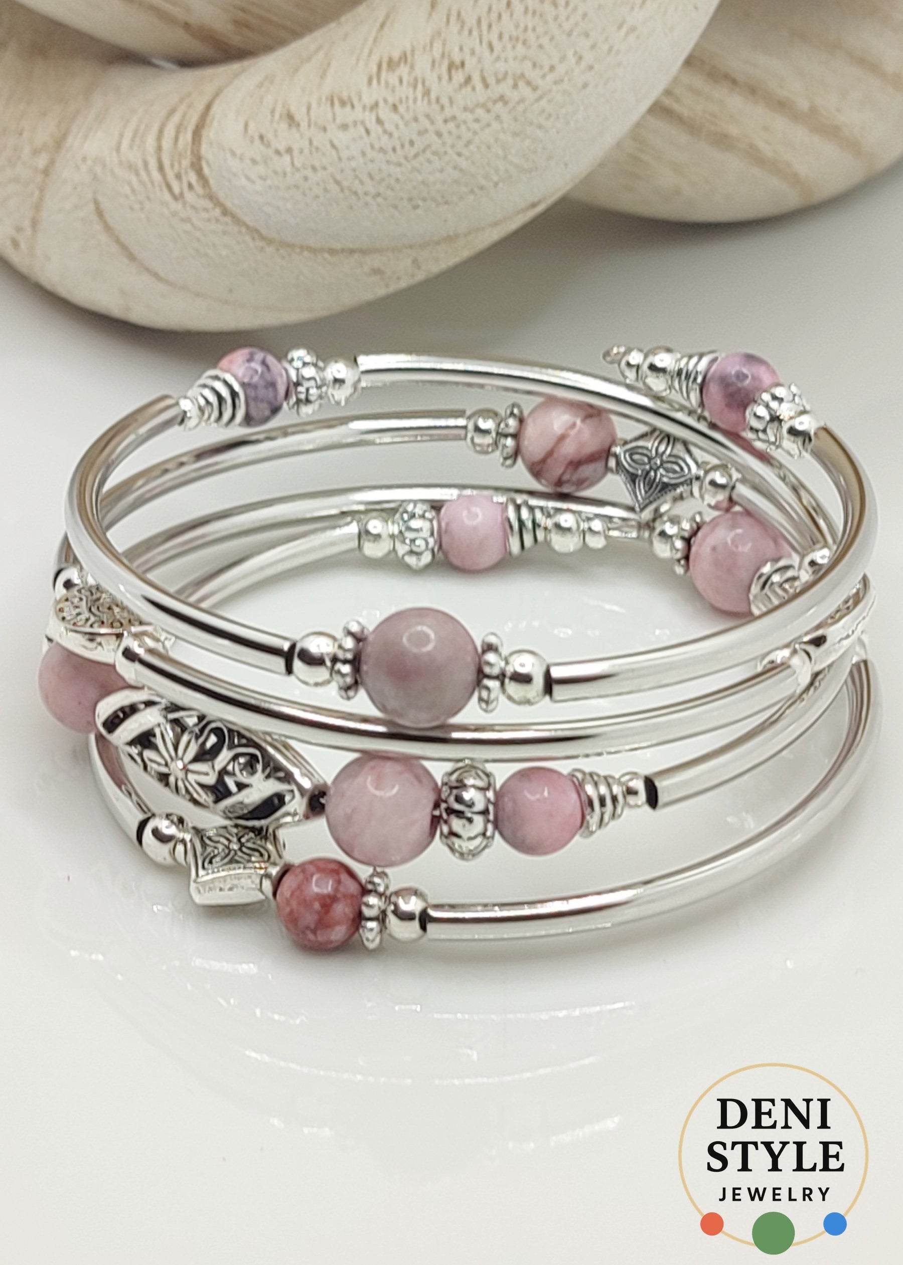 Finom rózsás árnyalatok és elegáns ezüst díszítőelemek találkozása. A pink zebra jáspis a női energiák és a belső egyensúly köve, amely békét és önbizalmat sugároz. A memória alap rugalmasan illeszkedik, így minden csuklón kényelmes viselet. Légies, romantikus és mégis időtálló darab.