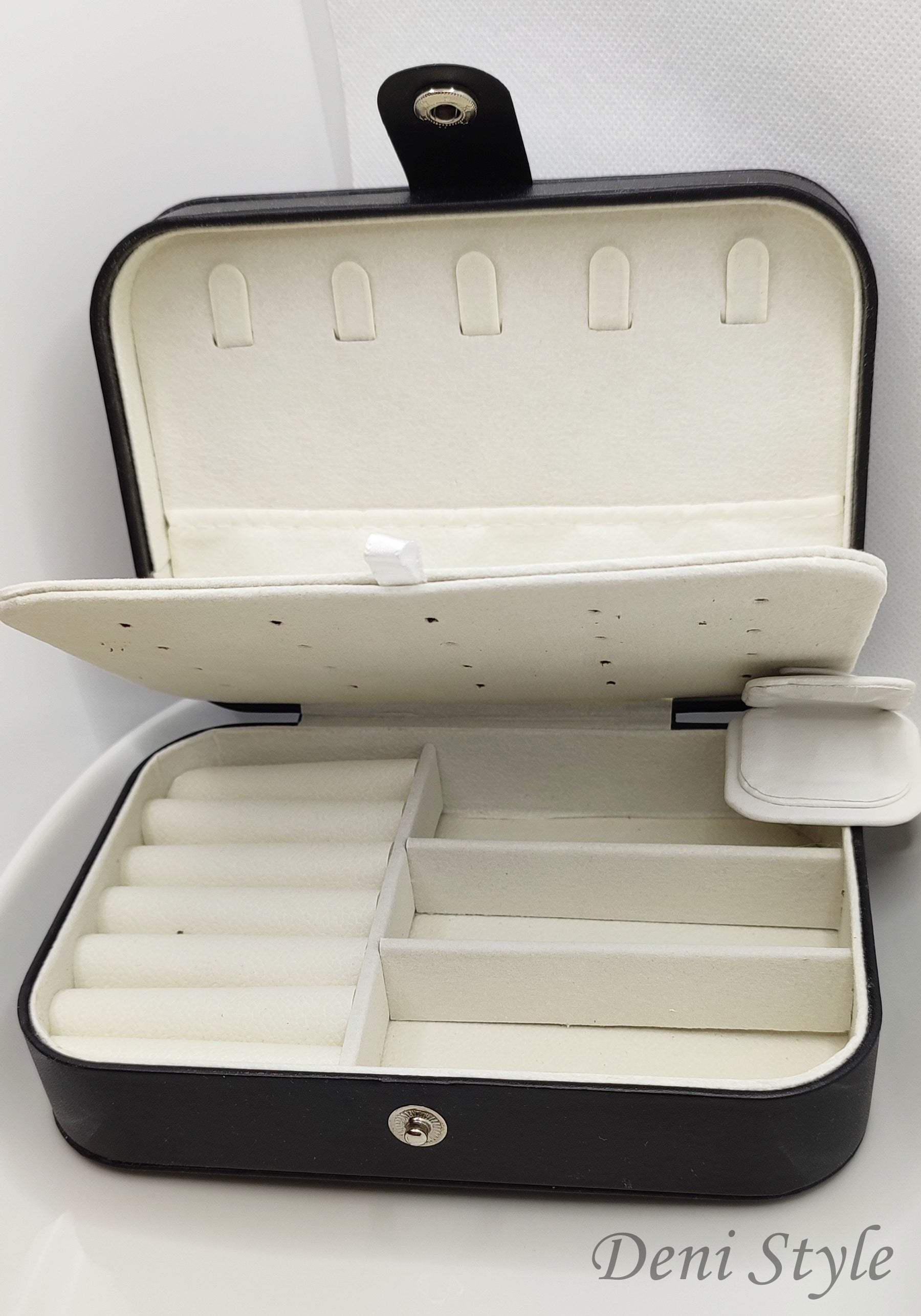 Elegáns, fekete ékszertartó doboz puha béleléssel, amely tökéletesen alkalmas fülbevalók, gyűrűk és nyakláncok rendszerezett tárolására. Kompakt méretének köszönhetően utazáshoz is ideális, miközben prémium megjelenést biztosít. Biztonságos záródása és belső rekeszei megóvják az ékszereket a sérüléstől és a karcolódástól.
